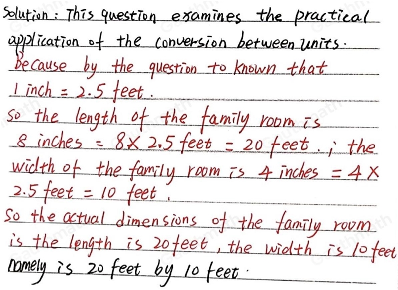 An architect draws a blueprint of the newly modeled family room she is designing for her basement. The scale she uses is 1 inch = 2.5 feet. If the length of the family room is 8 inches, and the width of the family room is 4 inches, what are the actual dimensions of the family room?