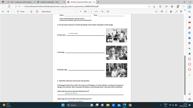 In plural, we change the article (EL = LOS, LA = LAS) and we add an S both to the noun and the adjective if they finish in vocals (A, E, I, O, U) or ES if they finish in a consonant: