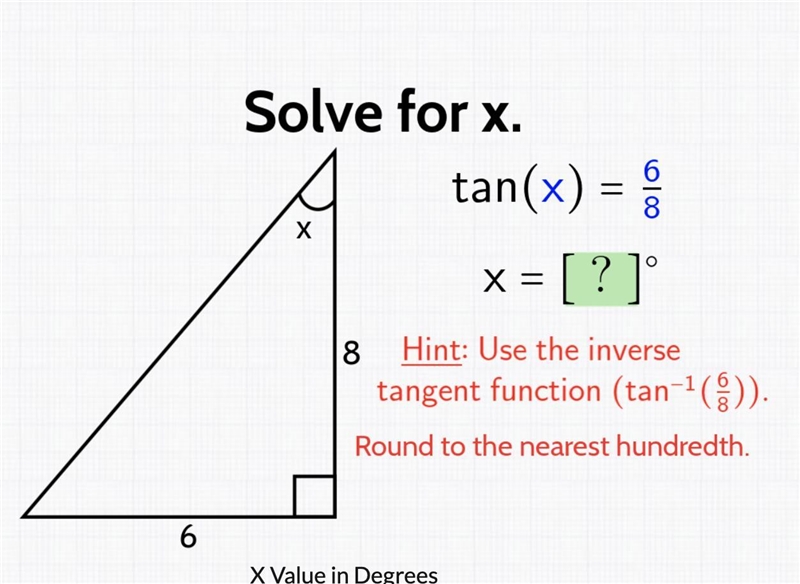 x = tan^-1 (6/8) = 36.87°