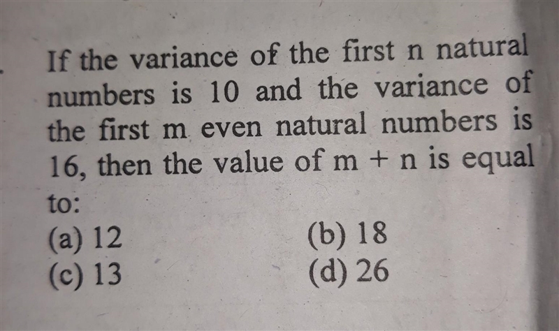 I believe it's asking, what is m + n, and it has given those values: 10 and 16. So, following this thinking, the answer is 16 + 10 = 26, so the correct answer would be: (d) 26