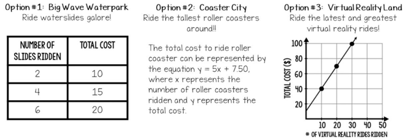 Each theme park charges an entrance fee plus an additional fee per ride. Write a function for each park. (3 points) a) write a function rule for Big Wave Waterpark b) write a fu…