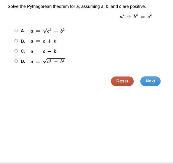 Solve the Pythagorean theorem for a, assuming a, b, and c are positive.