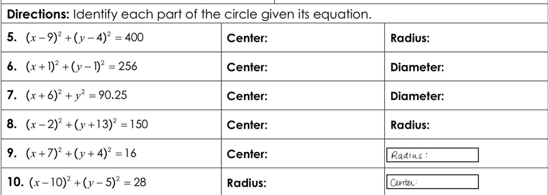 10. Center: (10, 5), Radius: √28 ≈ 5.29