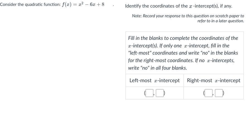 Consider the quadratic function: f(x)=x^2-6x+8 Identify the coordinates of the x(intercepts if any
