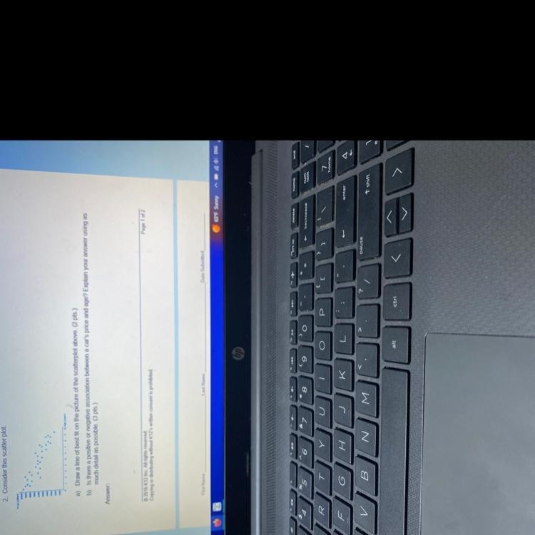 2. Consider this scatter plot. a) Draw a line of best fit on the picture of the scatterplot above. (2 pts.) b) Is there a positive or negative association between a car's p…