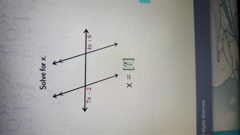 Let's assume that angle (7x-2) is angle P, and angle (4x+6) is angle Q. The lines are parallel, so angle P is correspondent to Angle F, meaning that they are equal.