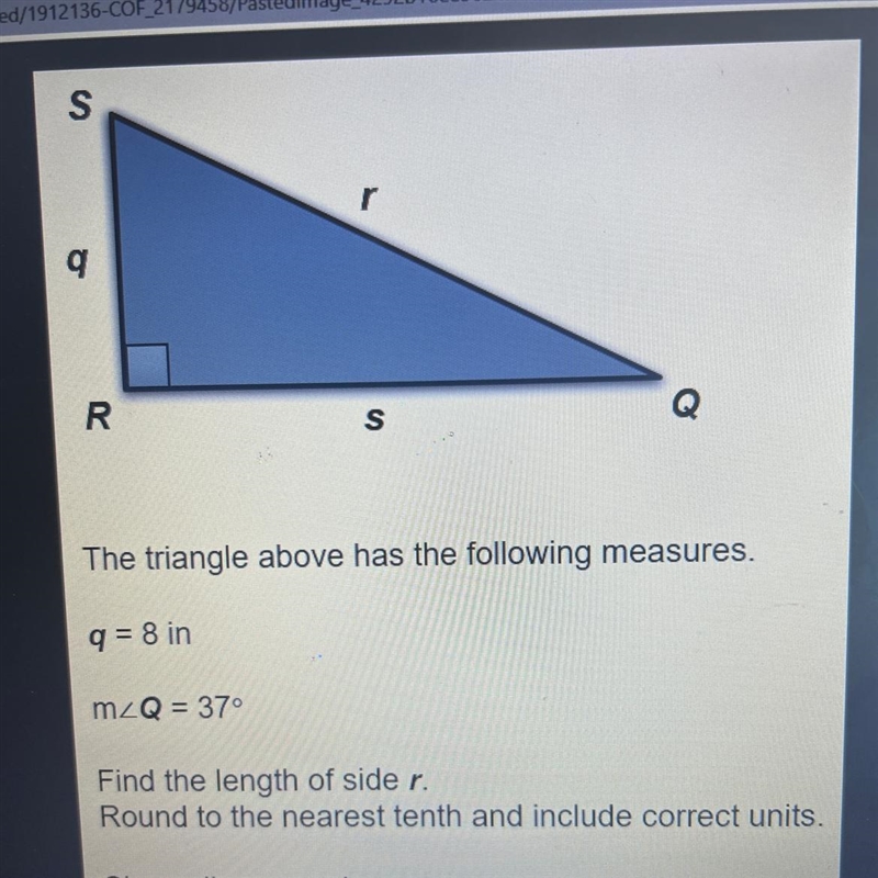 The triangle above has the follow measures. q= 8in m find the length of side r. Round to the nearest tenth and include correct units.