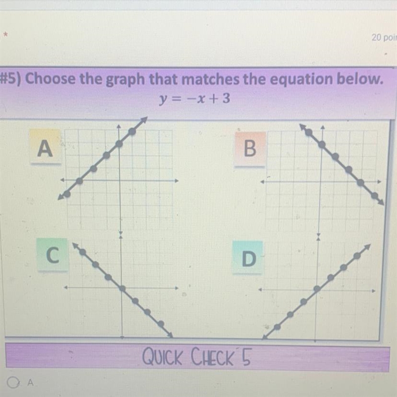 #5) Choose the graph that matches the equation below. y=-x+3 A C B D