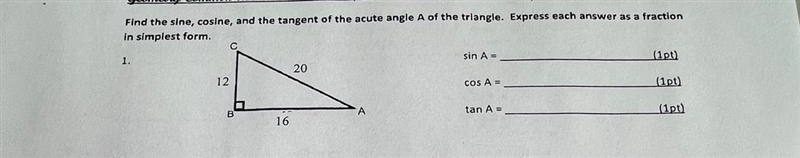 Find the sine, cosine, and the tangent of the acute angle A of the triangle. Express each answer as a fraction in simplest form.