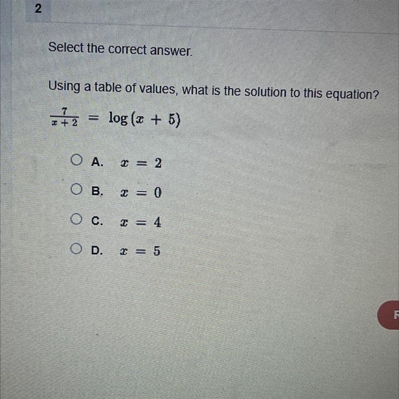 Select the correct answer. Using a table of values, what is the solution to this equation? 7/ x + 2 = log (x + 5)