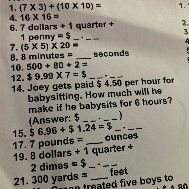 14. Joey gets paid $ 4.50 per hour for babysitting. How much will he make if he babysits for 6 hours? (Answer: $__:__) 11