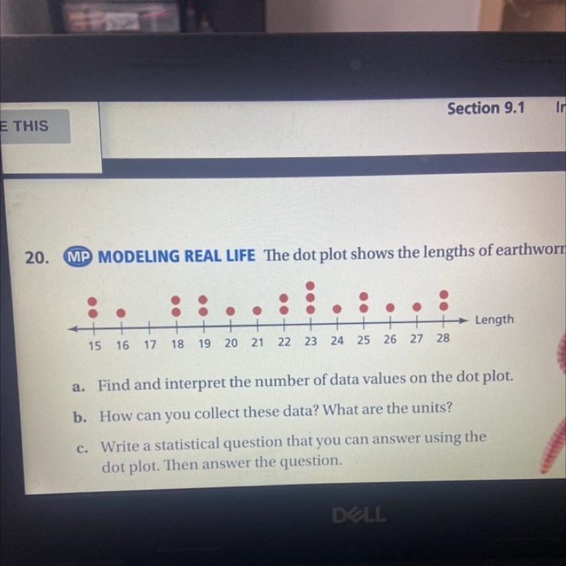 Answer: The range of the lengths of the earthworms in the sample can be found by subtracting the smallest value from the largest value. From the given dot plot, it appears that the smallest value is 15 and the largest value is 28. Therefore, the range of the lengths of the earthworms is: