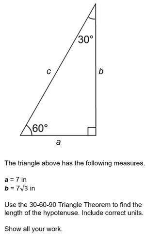 We know from the 30-60-90 Triangle Theorem that the side opposite the 30° angle is x and the side opposite the 60° angle is x√3, so 7 must be x. We further know that according to the theorem, the side opposite the 90° or right angle (aka the hypotenuse) is 2x. Since x is 7 in the diagram, the length of the hypotenuse must be 14 in as 2 * 7 = 14.