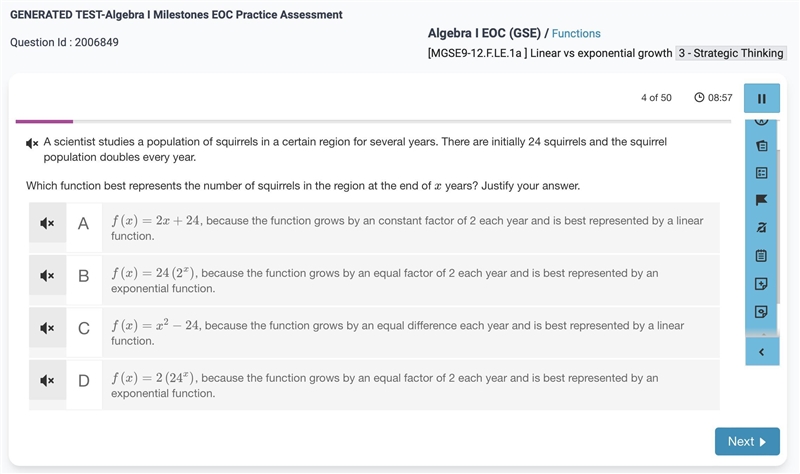 Therefore, the function that best represents the number of squirrels in the region at the end of x years is f(x) = 24 x 2^x.