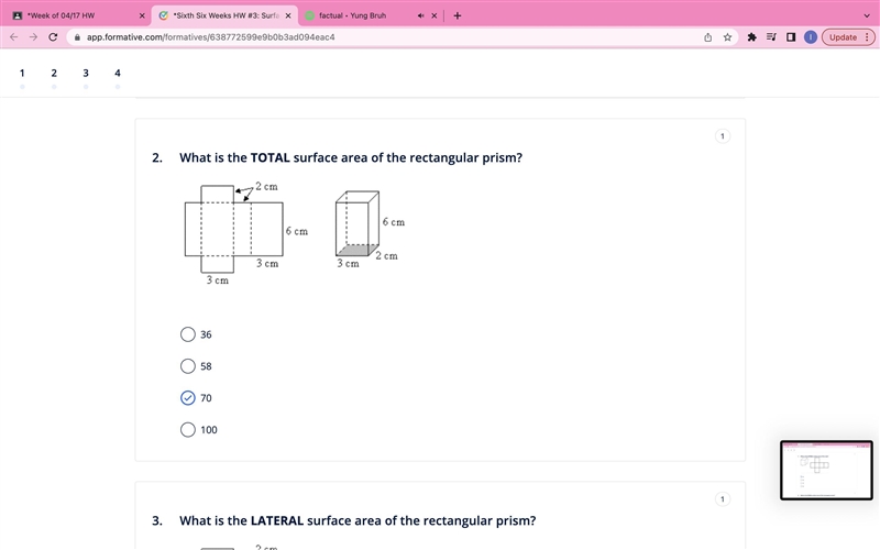 A(smallest) = Lw = 2*3=6 there are 2 of those A=12