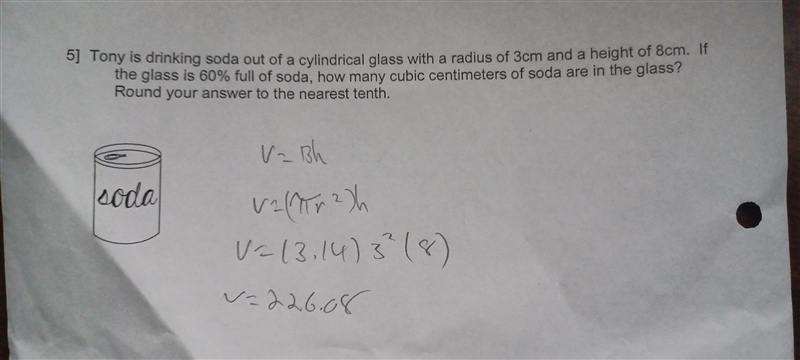 Volume of soda = 0.6 x 72π cm^3 = 43.2π cm^3