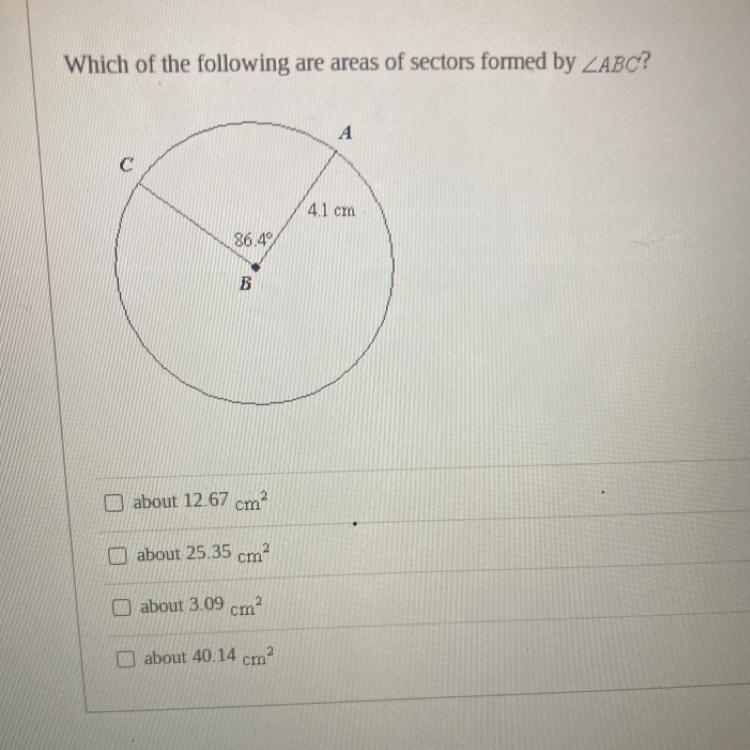 The central angle of this sector is approximately 19.16 degrees, which is not equal to the given angle of 86.4 degrees. Therefore, the area "about 3.09 cm²" is not a possible area of the sector formed by angle CBA.