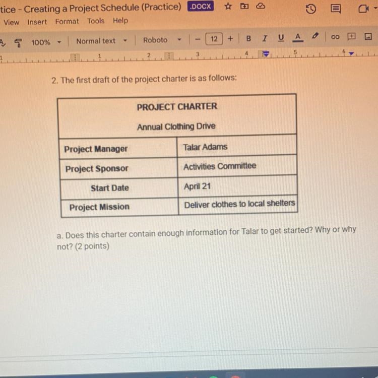 The charter provides some basic information about the project, such as the project manager, sponsor, start date, and mission. However, it does not provide enough details about the project's scope, objectives, budget, timeline, stakeholders, and risks. Talar needs more information to understand the project's requirements, constraints, and expectations. She also needs to define the project's deliverables, milestones, and success criteria. Without a clear and comprehensive project charter, Talar may face difficulties in planning, executing, and controlling the project, as well as communicating with stakeholders and managing their expectations. Therefore, Talar should revise the project charter to include all the necessary information and obtain approval from the project sponsor before proceeding with the project.