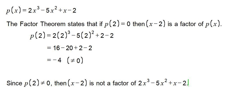 How could you determine if x - 2 is a factor of 2 x 3 - 5 x 2 + x - 2 ?