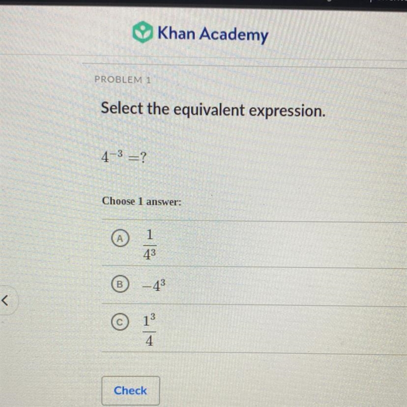 Select the equivalent expression. 4-3 =? Choose 1 answer: A B 1 43 -4³ 4