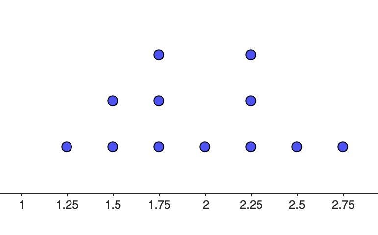 A line plot of the data can be formed by making a mark above the number line for each point that has that value. For example, there are two instances of the value 1.50, so the plot will have two marks above 1.50 on the number line.