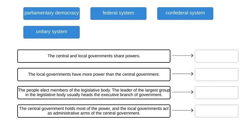 Unitary system: The central government holds most of the power, and the local governments act as administrative arms of the central government.