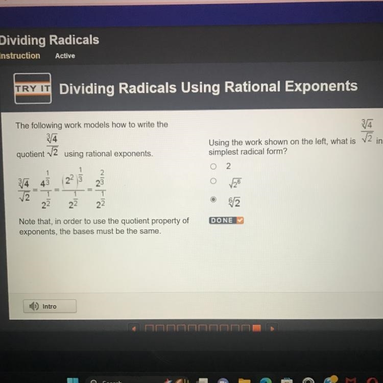 ![(2^(2)/(3))/(2^(1)/(2))=2^{(2)/(3)-(1)/(2)}=2^(1)/(6)=\boxed{\sqrt[6]{2}}](https://img.qammunity.org/2024/formulas/mathematics/high-school/ac0a645b9gjjkvucbhigabcu22rz21e72o.png)