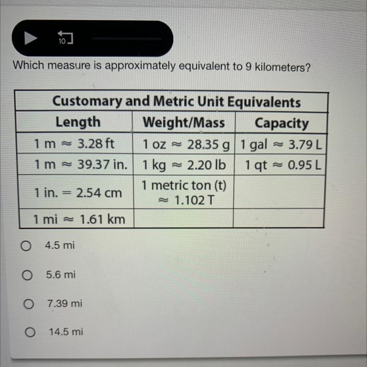 9 km ≈ 9 x 1/1.61 ≈ 9/1.61 ≈ 5.592341 miles