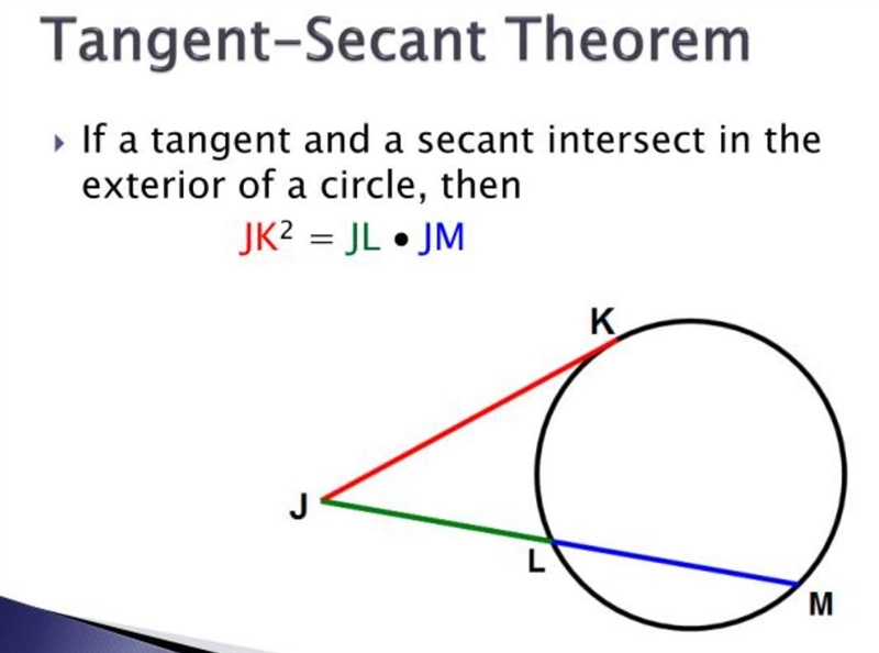 Tangent-Secant Theorem => tangent² =(secant outside)(full secant)