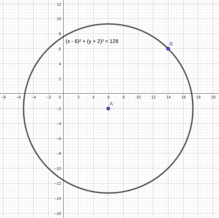 (14 -6)² +(6 -(-2))² = r² = 8² +8² = 128