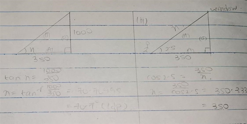 if you are standing 350 feet away from a "1000" foot tall skyscraper, what angle of elevation is needed for you to look up and see the top of the building? when your angle of elevation is at 25 degrees you see your friend waving at the window. exactly how far apart are you?