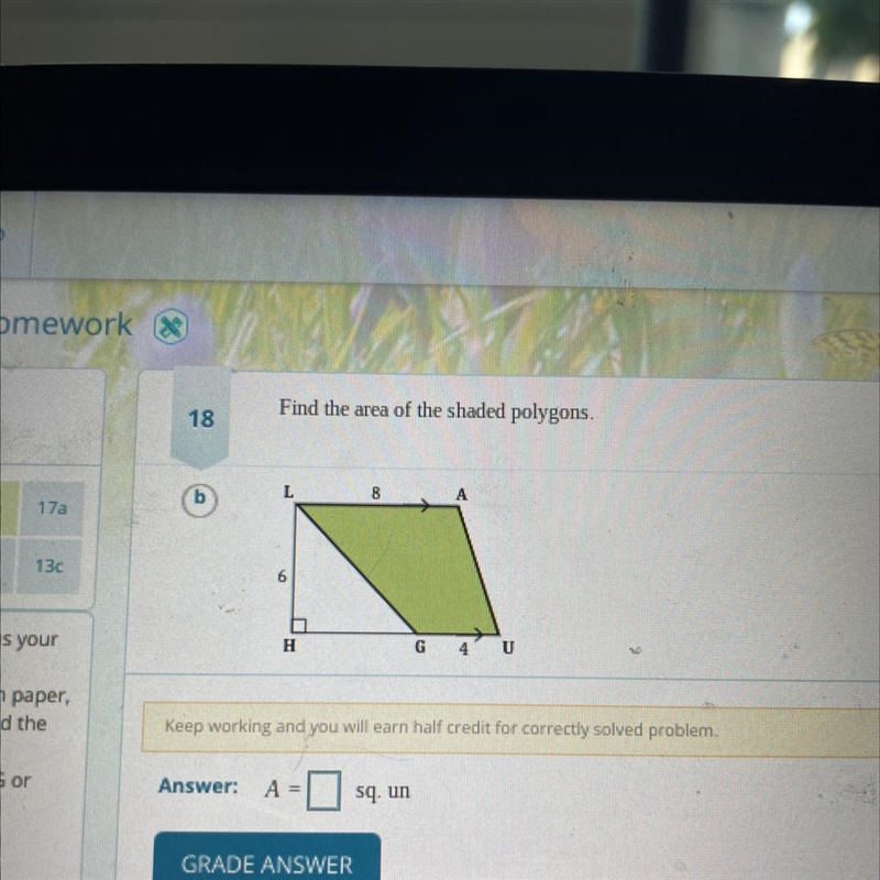 Answer is 36. Formula is 1/2 (b1+b2)h. Your base 1 is 4 and base 2 is 8, and your height is 6. Those equal 72, and 72/2 is 36