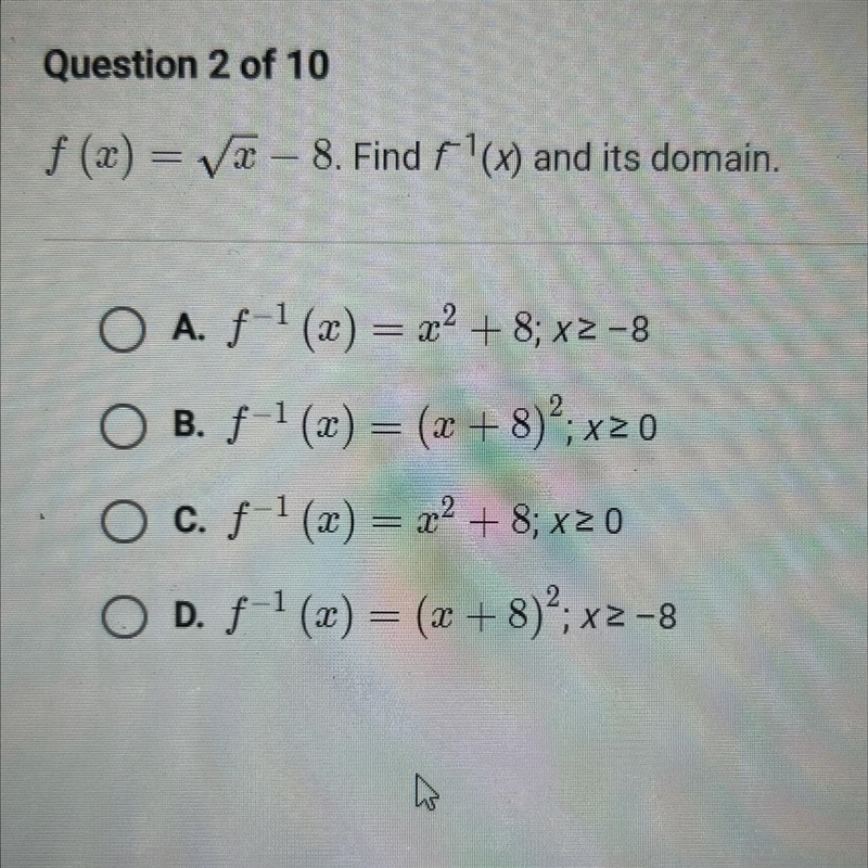 The domain of f(x) is all the values of x that make the expression inside the square root non-negative, that is, x - 8 ≥ 0. Solving for x, we get x ≥ 8. Therefore, the domain of f(x) is x ≥ 8.