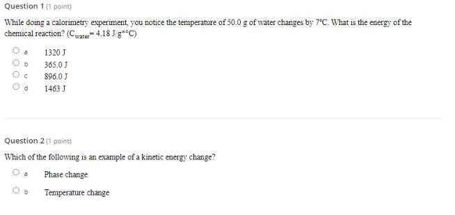 1. While doing a calorimetry experiment, you notice the temperature of 50.0 g of water changes by 7ºC. What is the energy of the chemical reaction? (Cwater= 4.18 J/g*°C) 2. Whic…