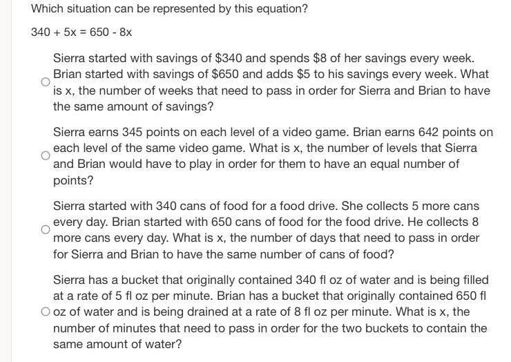 The situation that can be represented by the equation 340 + 5x = 650 - 8x is "Sierra started with savings of $340 and spends $8 of her savings every week. Brian started with savings of $650 and adds $5 to his savings every week. What is x, the number of weeks that need to pass in order for Sierra and Brian to have the same amount of savings?"