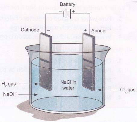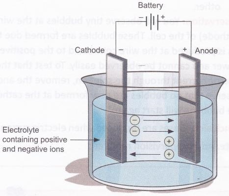 The production of a chemical reaction by passing an electric current through an electrolyte is called electrolysis. We know that an electrolyte contains ions, which are charged. The positively charged ions are called cations, because they are attracted to the cathode, and the negatively charged ones are called anions because they are attracted to the anode. We know that unlike charges attract and like charges repel. Cations, being positively charged, get attracted to the negatively charged cathode and move toward it. Anions, being negatively charged, get attracted to the positively charged anode and move toward it. This explains how ions move in an electrolytic cell, and thus ‘conduct’ an electric current. A chemical reaction takes place at the anode and the cathode. This can be observed as the formation of bubbles (due to the production of gases) or deposition of metal on the electrodes or a change in the color of the electrolyte. The reaction varies depending on the metals used for the electrodes and the electrolyte chosen. Electrolysis of a solution of sodium chloride (NaCl) produces hydrogen gas (H2), chlorine gas (Cl2), and sodium hydroxide (NaOFI).