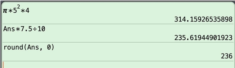 V = π(5 ft)²(4 ft) = 100π ft³ ≈ 314.159 ft³