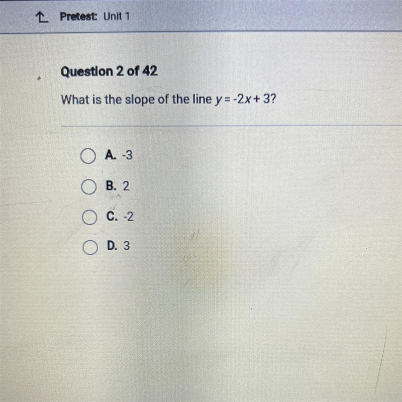 What is the slope of the line y=-2x+3? A. -3 OB. 2 C. -2 D. 3