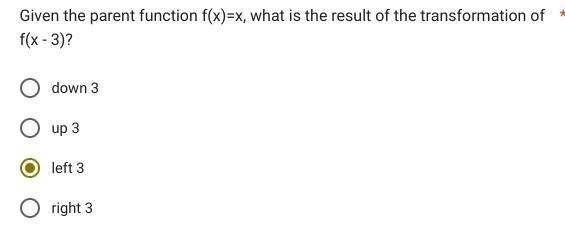 Because the translation is applied inside the parentheses, we are shifting the function left/right. To determine whether it is shifted left or right, note that shifting right will have a negative number and shifting left will have a positive number. Since we have a negative number -3, it is shifted right.