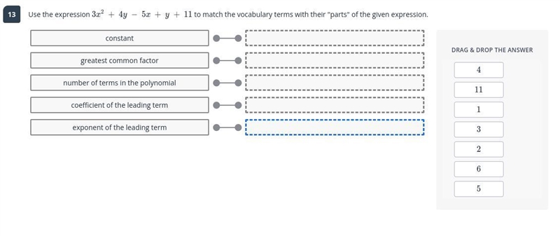 To match the vocabulary terms with their “parts” of the given expression, you need to drag and drop the correct numbers from the options. Here are the matches: