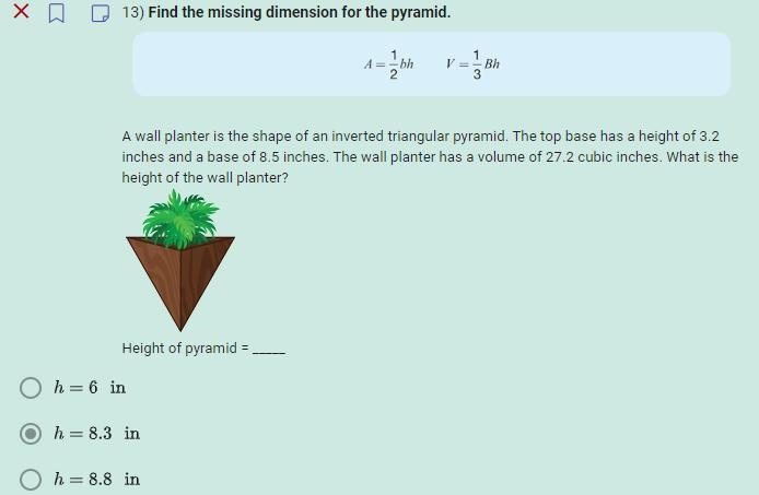 ⅓ × base area × height = 27. 2