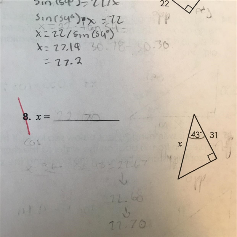 Cos (43°) ×X = 31