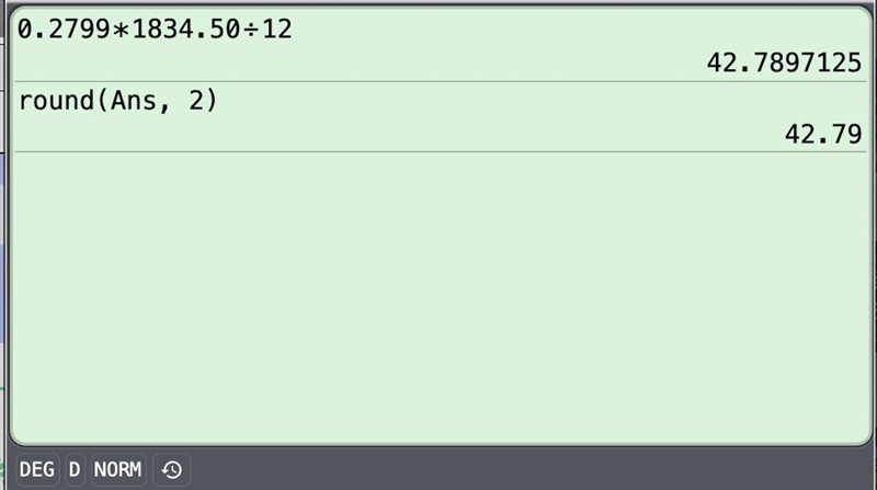 I = $1834.50 × 0.2799 × 1/12 ≈ $42.79
