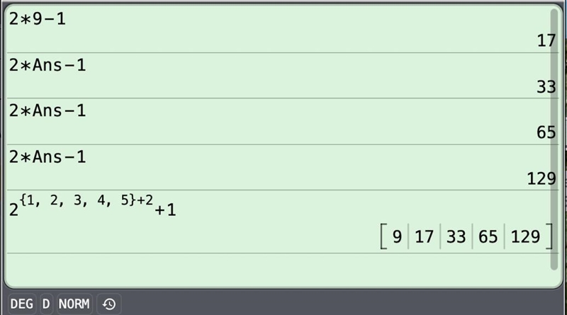 After seeing the first few terms, we can speculate that a formula for term n is f(n) = 2^(n+2) +1