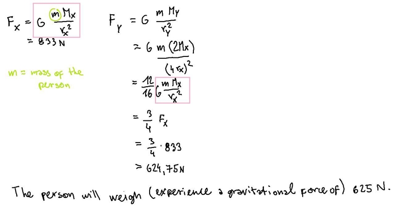A person weighs 833.0N on the surface of Planet X. Plant Y is 2 times the mass and 4 times the radius of Planet X. Calculate the weight of the person on Planet Y.