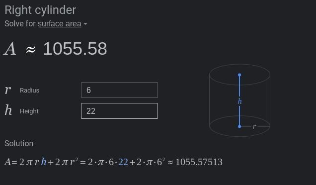 The process is A=2π r h+2π r^2=2·π·6·22+2·π·6^2≈1055.57513. here is some examples