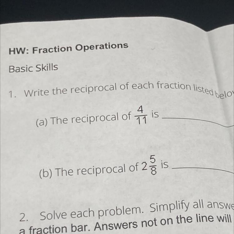 The reciprocal of 4/11 is 11/4 just switch the numbers around and the The reciprocal of 2 5/8 is is 8/21 because 2x5+8= 21 and the fraction will be 21/8 then you switch it to 8/21