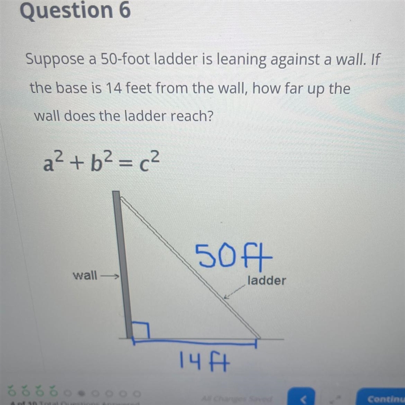 Suppose a 50-foot ladder is leaning against a wall. If the base is 14 feet from the wall, how far up the wall does the ladder reach?