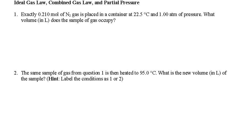 At conditions 2, we know P2 = 1.00 atm (pressure is constant), n2 = n1 (number of moles is constant), and T2 = 95.0 + 273.15 = 368.15 K.