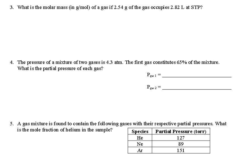3. At STP (standard temperature and pressure), which is 0 °C (273.15 K) and 1 atm, the molar volume of an ideal gas is 22.4 L/mol. Therefore, the number of moles of gas can be calculated as: